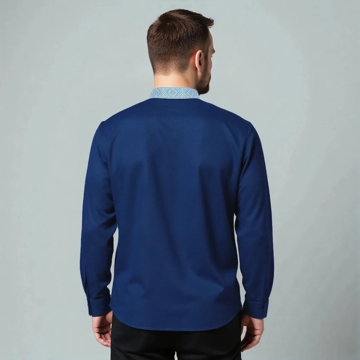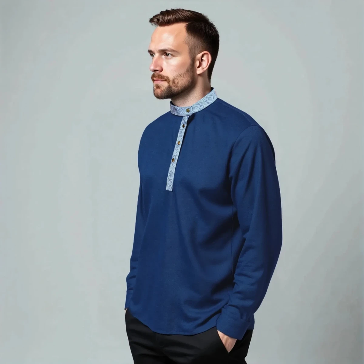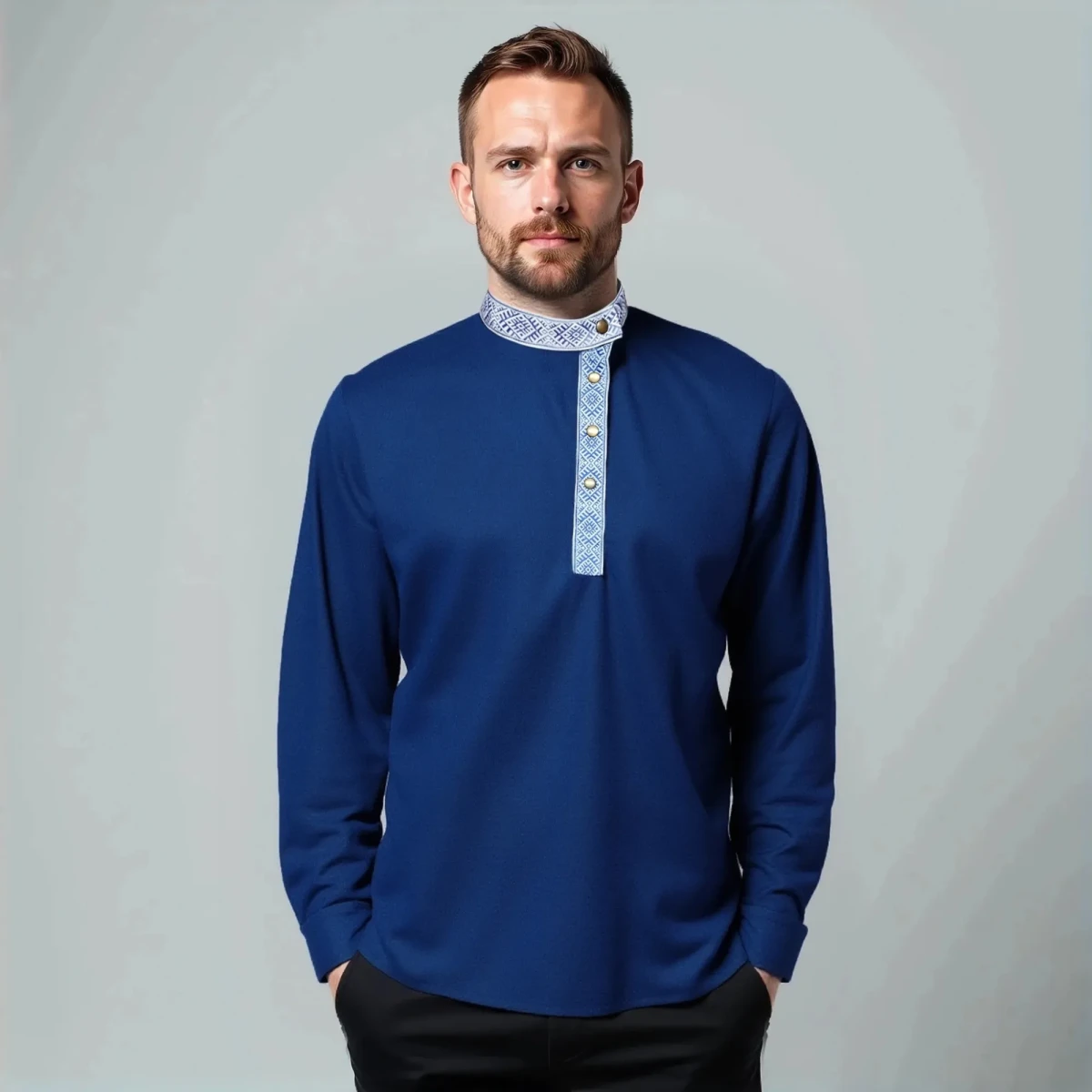 Косоворотка мужская с длинным рукавом имеет прямой, свободный крой, классический косой воротник и застежку на кнопки. А также мужская рубаха косоворотка по планке и стойке украшена стилизованной тесьмой в контрастной сине-белой расцветке, которая помогает выглядеть оригинально и празднично. Практичный состав ткани позволит чувствовать себя комфортно в любых условиях, будь это рабочее совещание или встреча в семейном кругу.