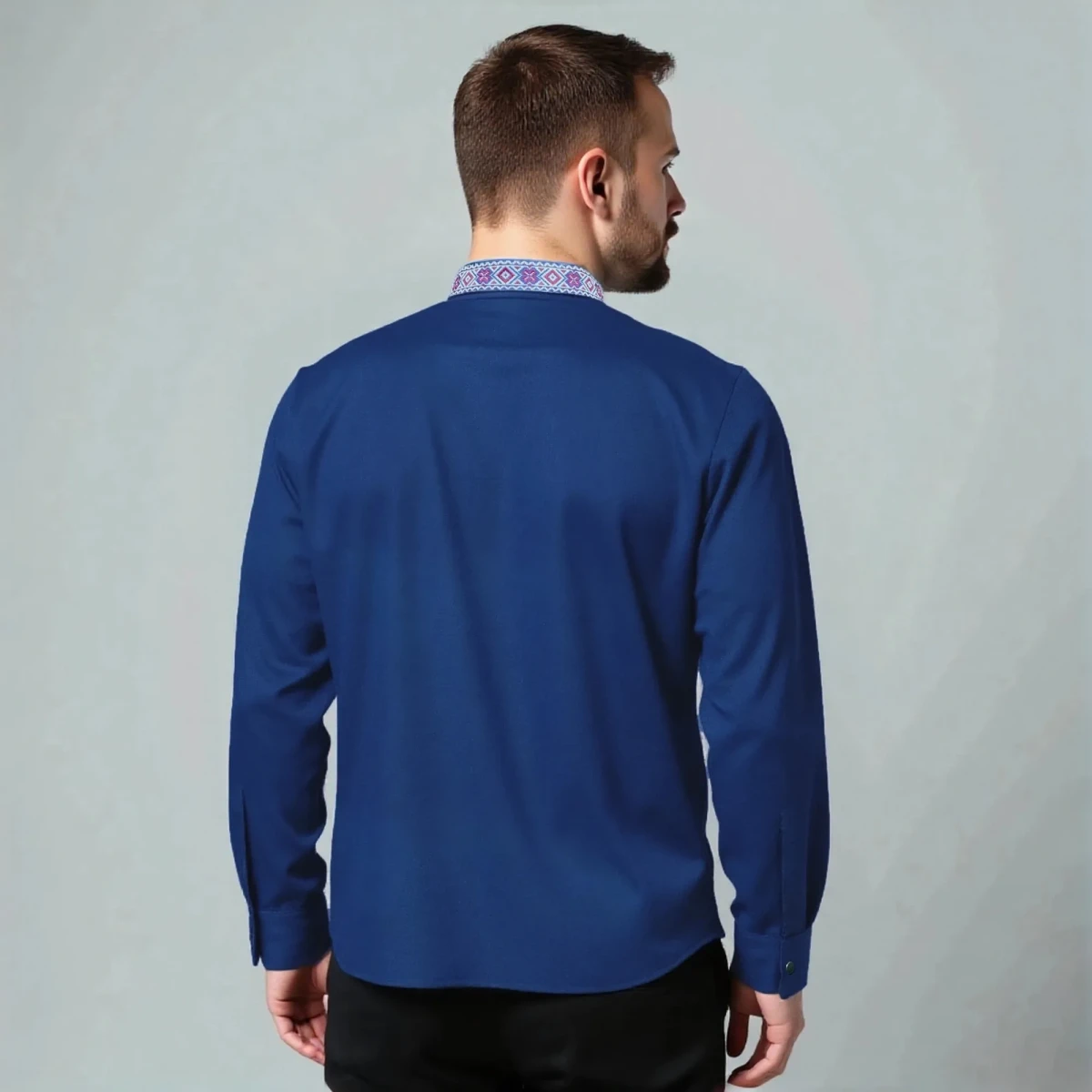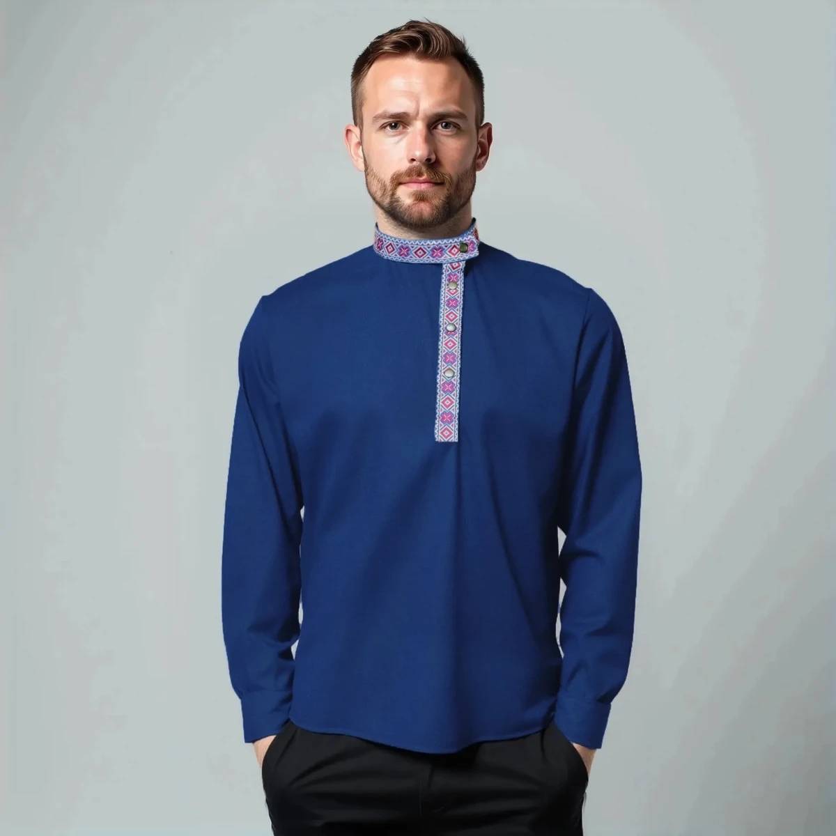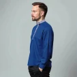 Косоворотка мужская с длинным рукавом имеет прямой, свободный крой, классический косой воротник и застежку на кнопки. А также мужская рубаха косоворотка по планке и стойке украшена стилизованной тесьмой, которая помогает выглядеть оригинально и торжественно. Практичный состав ткани позволит чувствовать себя уютно в любых условиях, будь это рабочее совещание или встреча в семейном кругу.