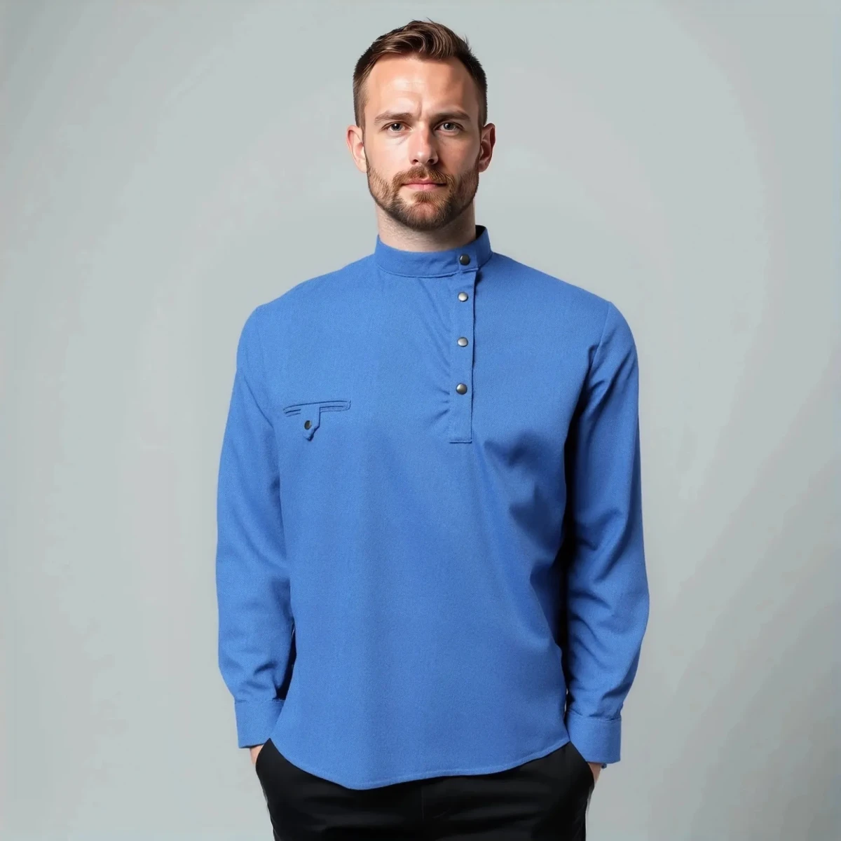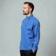 Косоворотка мужская с длинным рукавом имеет прямой, свободный крой, классический косой воротник и застежку на кнопки. Практичный состав ткани позволит чувствовать себя уютно в любых условиях, будь это рабочее совещание или встреча в семейном кругу.