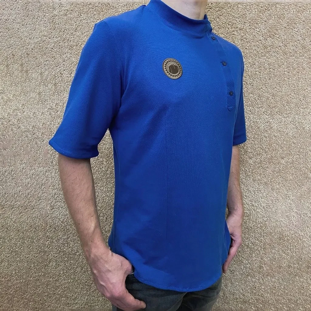 Косоворотка мужская современная с коротким рукавом имеет приталенный силуэт и классический косой воротник-стойку на 4 пуговицы. А также мужская рубаха косоворотка украшена стилизованным шевроном «Народный праздник «День Косоворотки» на груди.