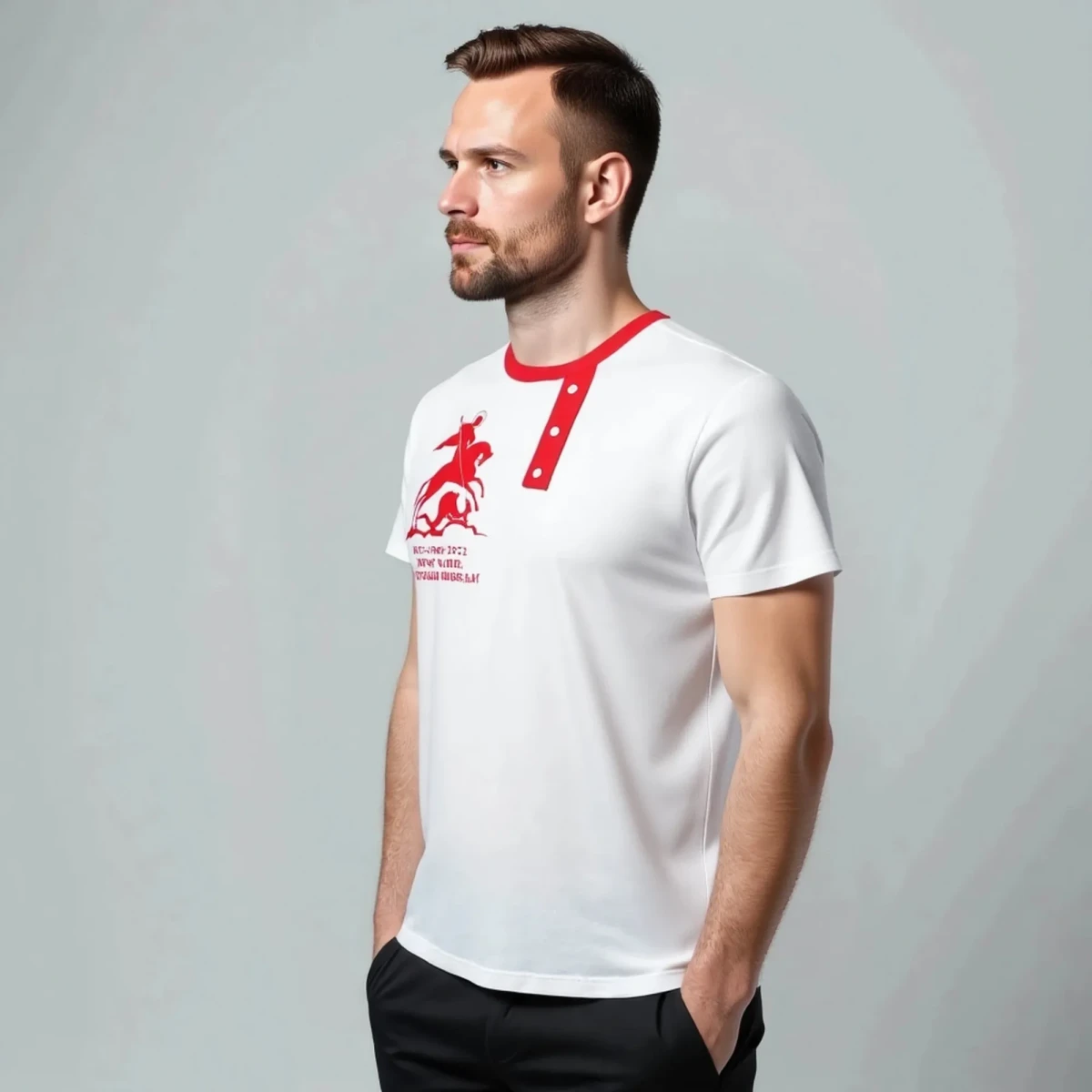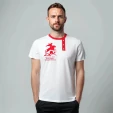 Футболка - косоворотка представлена в универсальном, базовом белом цвете с красной отделкой и принтом. Имитация планки декорирована пуговицами. Размерный ряд от S до XXL. Рисунок напечатан специальными красками методом шелкографии.