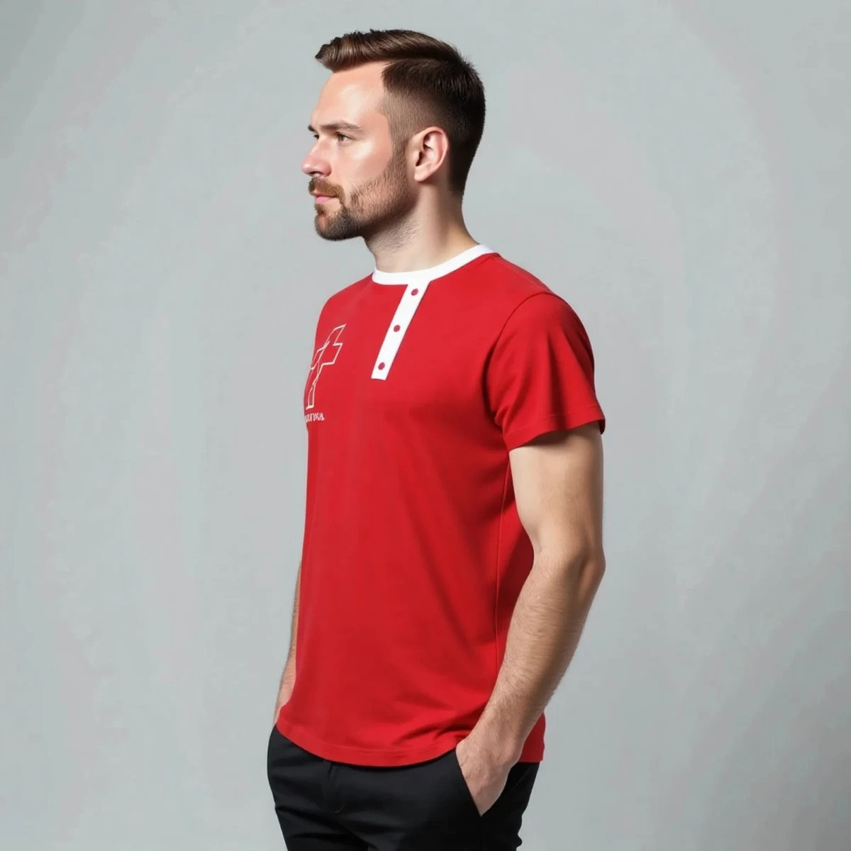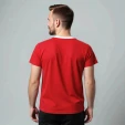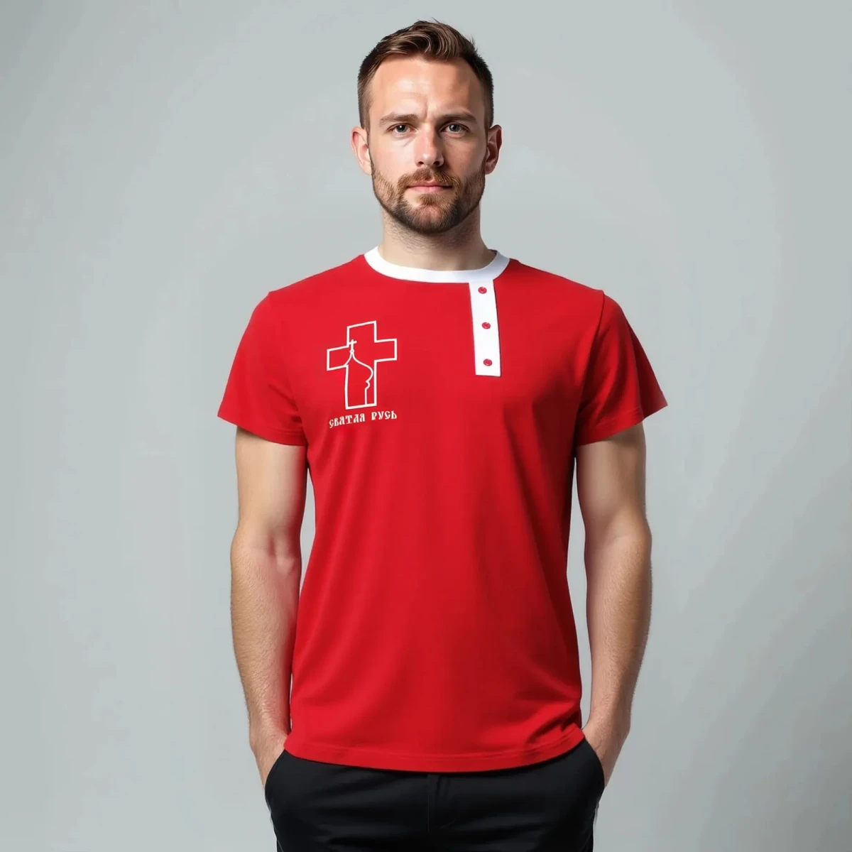 Футболка-косоворотка представлена в красном цвете с белой отделкой и принтом. Размерный ряд от S до XXL. Оригинальный принт на передней части футболки и имитация планки, декорированная пуговицами, подчеркивает ее уникальность и станет изюминкой в вашем имидже. Рисунок напечатан специальными красками методом шелкографии.