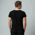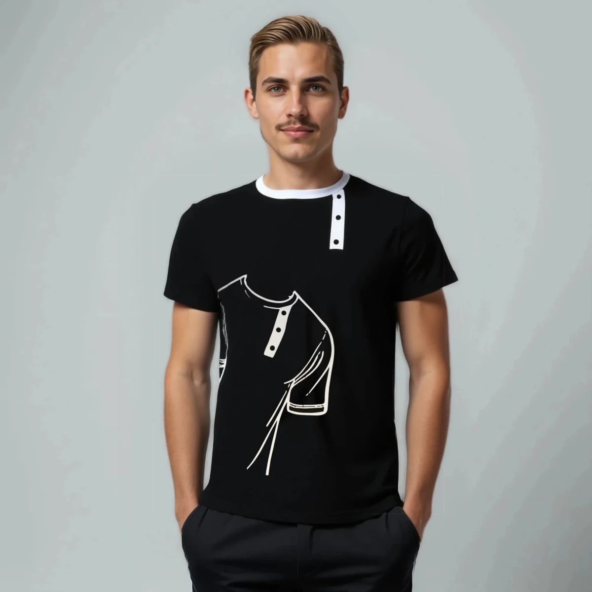 Она станет отличной универсальной вещью на каждый день и на любой сезон, а также будет замечательным подарком друзьям, коллегам и родным. Футболка - косоворотка представлена в черном цвете с белым противопоставляемым принтом. Имитация планки декорирована пуговицами. Размерный ряд от S до XXL.