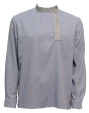 Косоворотка мужская с длинным рукавом имеет прямой, свободный крой, классический косой воротник и застежку на кнопки. А также мужская рубаха косоворотка по планке и стойке украшена стилизованной тесьмой в контрастной коричневой расцветке, которая помогает выглядеть неповторимо и торжественно.
