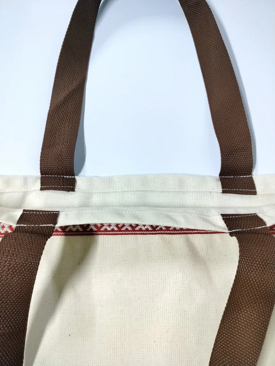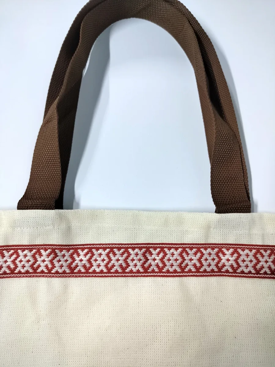 Сумка-шоппер бежевая изготовлена из двунитки, материала повышенной плотности из 100% хлопка. Детали сумки-шоппера: одно отделение, прочные и удобные ручки коричневого цвета, стилизованная тесьма «Орепей» в русском стиле.