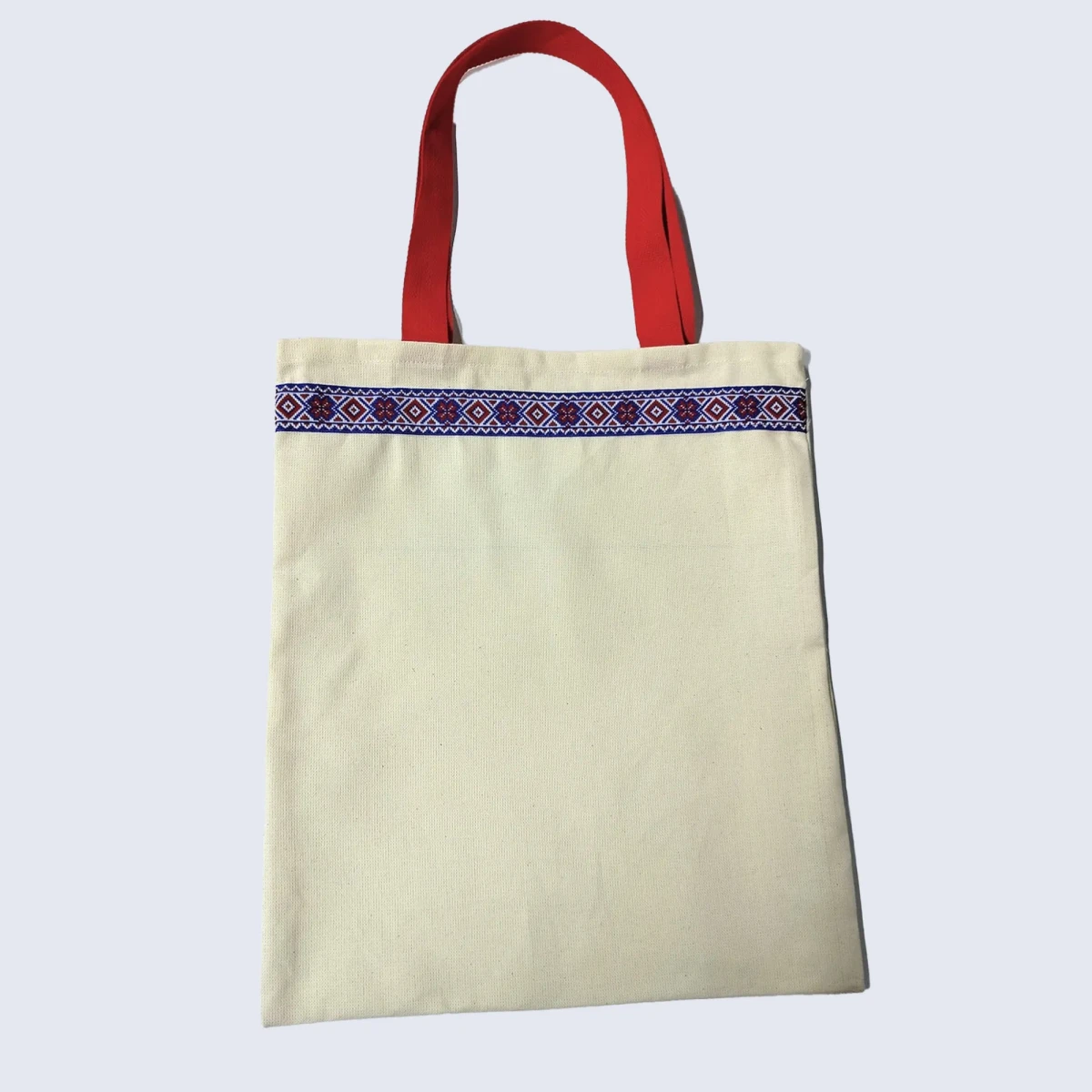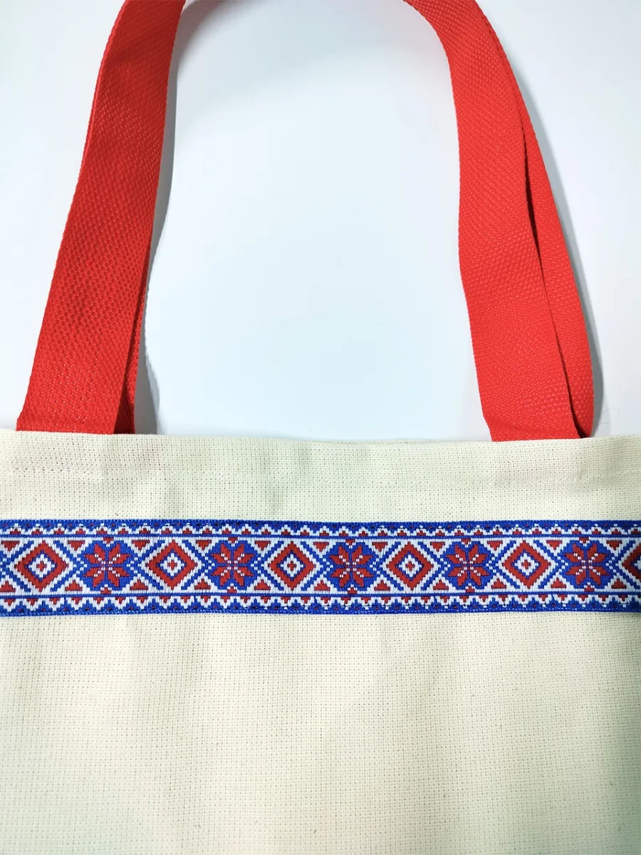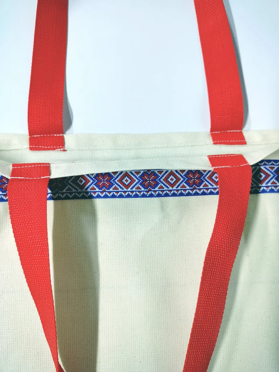 Сумка-шоппер бежевая изготовлена из двунитки, материала повышенной плотности из 100% хлопка. Детали сумки-шоппера: одно отделение, прочные и удобные ручки красного цвета, стилизованная тесьма «Василёк» в русском стиле.