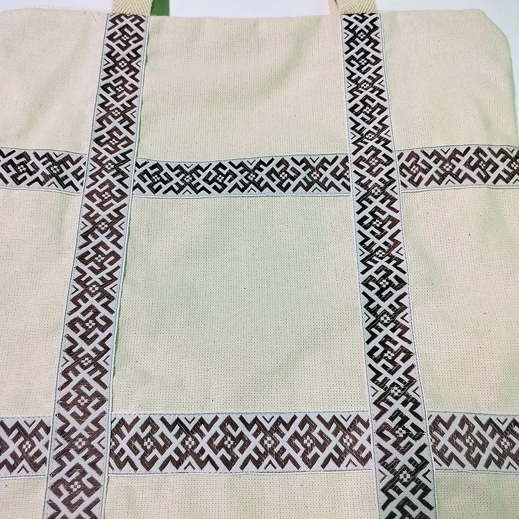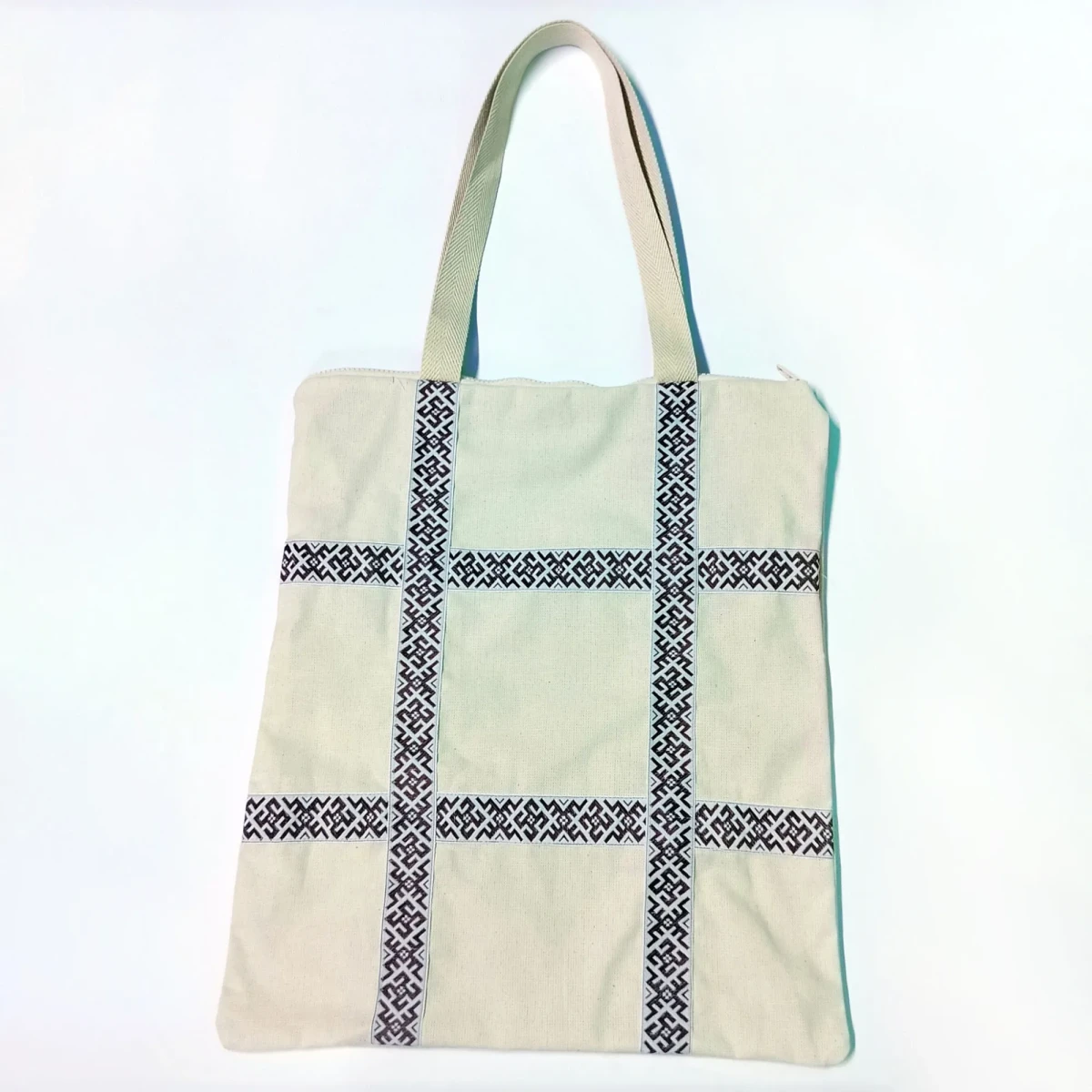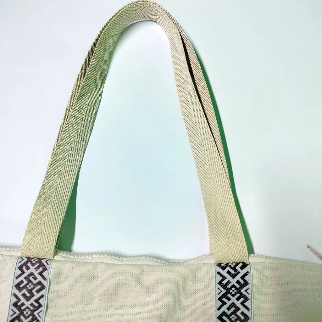 Сумка-шоппер бежевая изготовлена из двунитки, материала повышенной плотности из 100% хлопка. Детали сумки-шоппера: одно отделение, внутренний карман, прочные ручки, стилизованная тесьма «Коловрат с цветком» в русском стиле, застежка-молния.