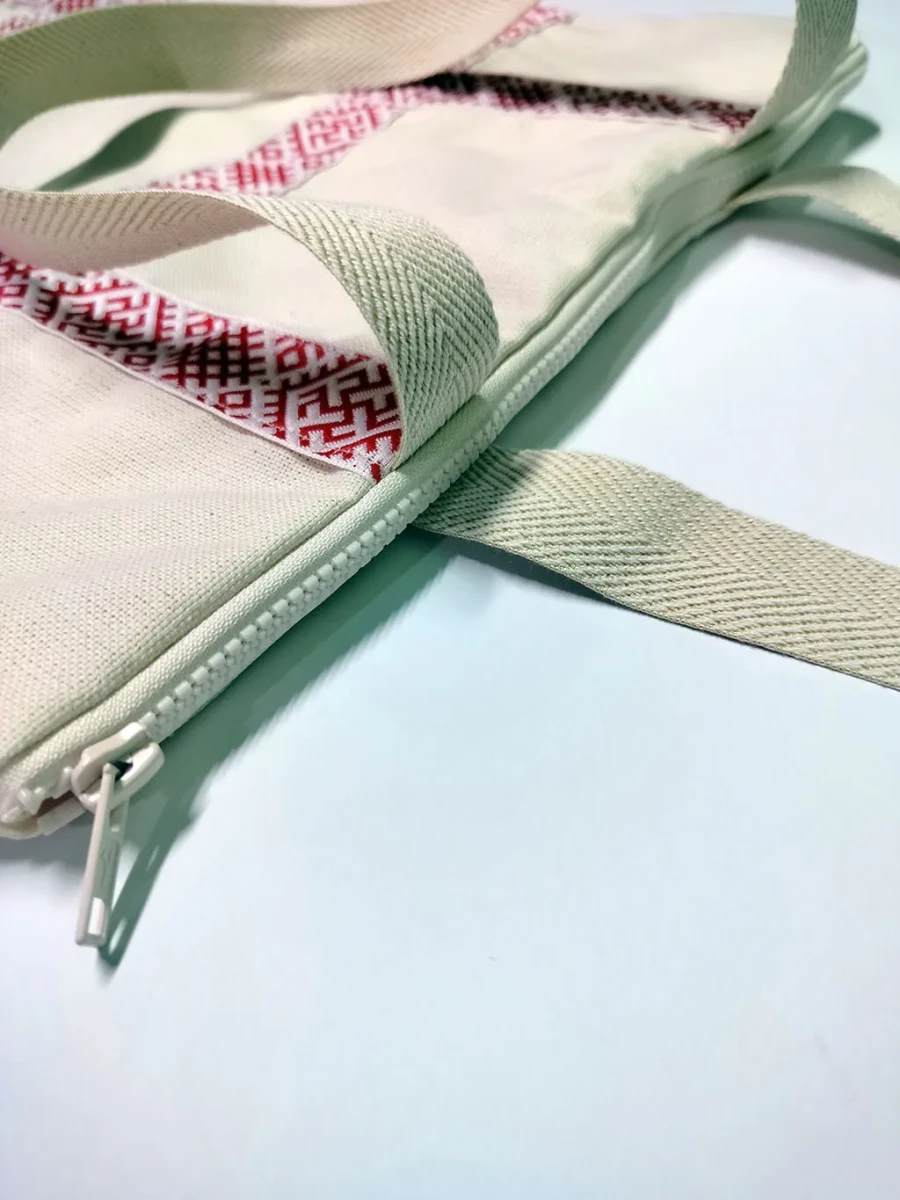Сумка-шоппер бежевая изготовлена из двунитки, материала повышенной плотности из 100% хлопка. Детали сумки-шоппера: одно отделение, внутренний карман, прочные ручки, стилизованная тесьма «Паутинка» в русском стиле, застежка-молния.