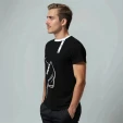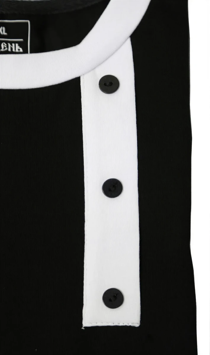 Она станет отличной универсальной вещью на каждый день и на любой сезон, а также будет замечательным подарком друзьям, коллегам и родным. Футболка - косоворотка представлена в черном цвете с белым противопоставляемым принтом. Имитация планки декорирована пуговицами. Размерный ряд от S до XXL.