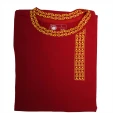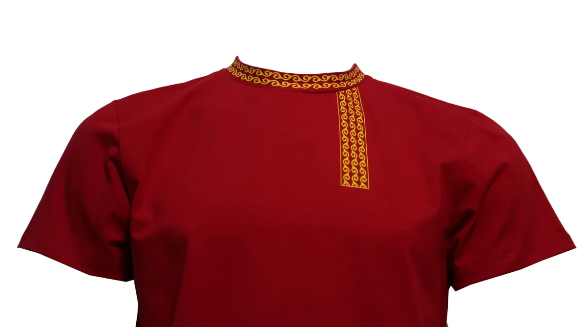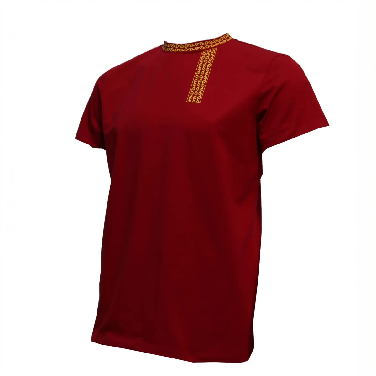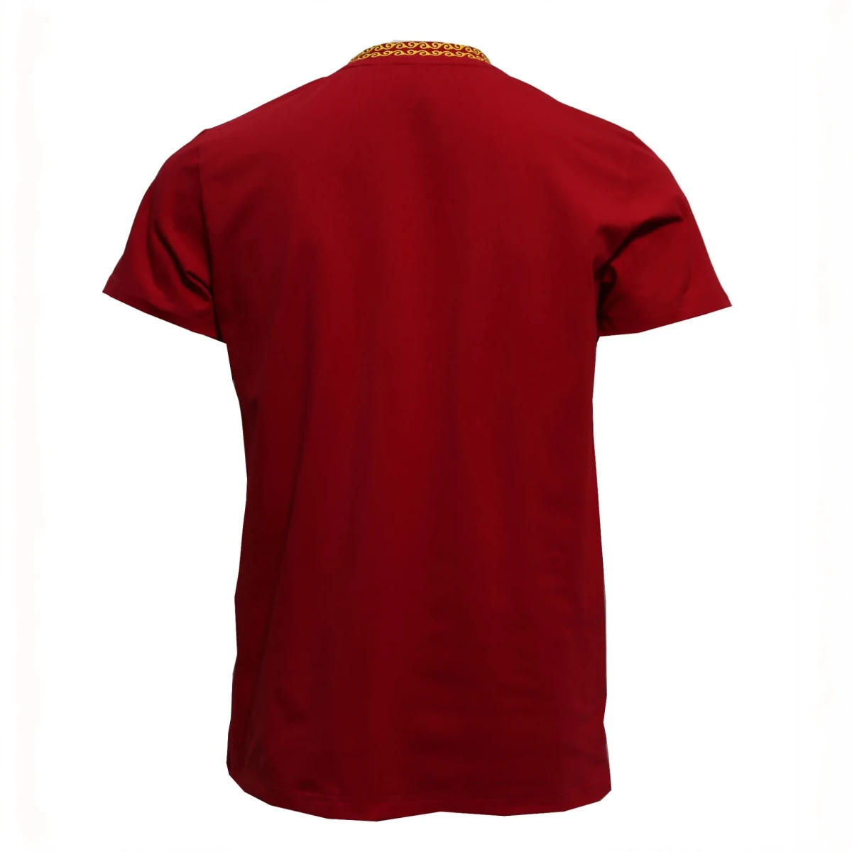 Мужская футболка-косоворотка «Красная» выполнена по авторской инновационной методике нанесения узора по горловине изделия и имитации планки.