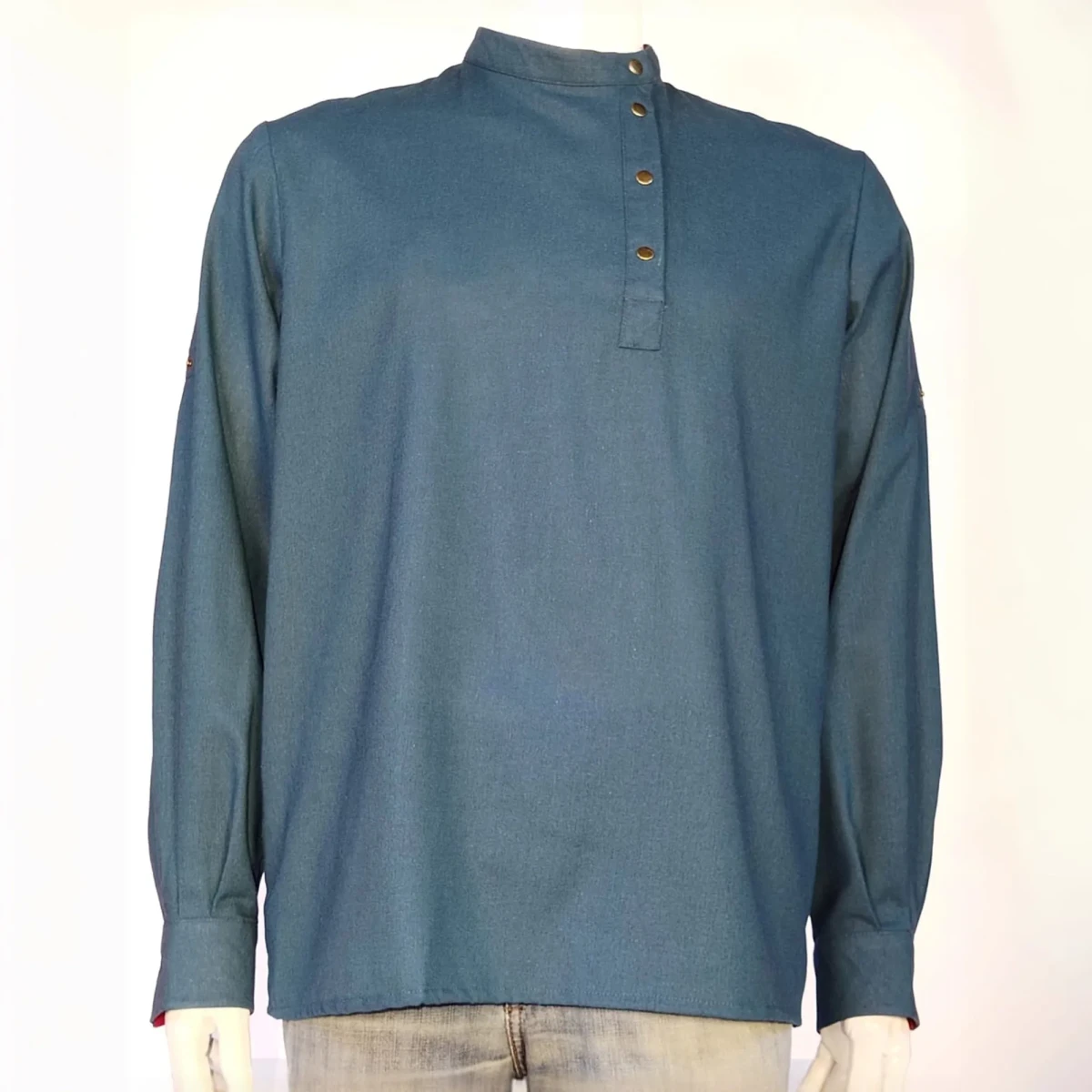 Косоворотка мужская с длинным рукавом имеет прямой, свободный крой, классический косой воротник и застежку на кнопки. Рукава подкатываются и застегиваются хлястиком (патой). Практичный состав ткани позволит чувствовать себя уютно в любых условиях, будь это рабочее совещание или встреча в семейном кругу.