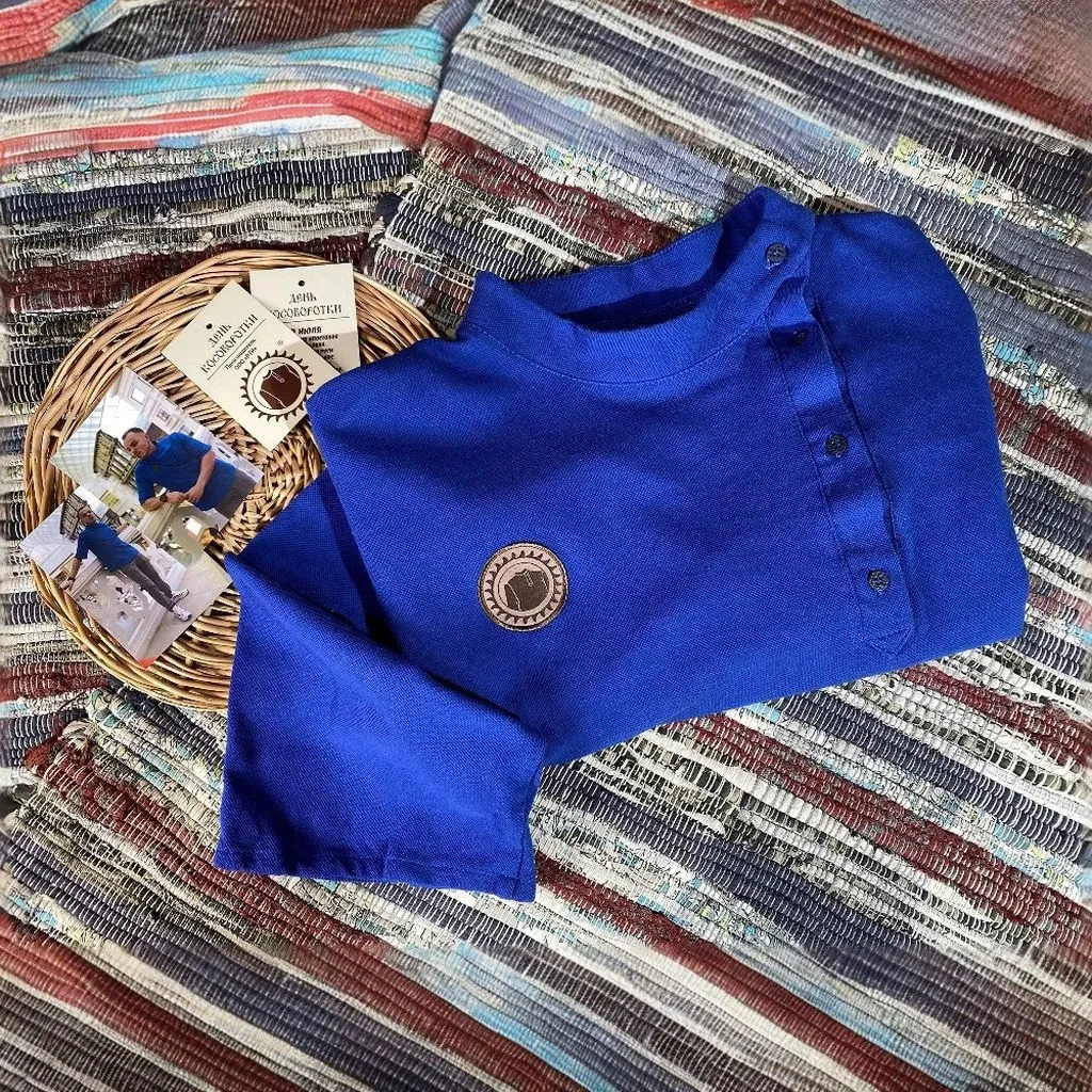Косоворотка мужская современная с коротким рукавом имеет приталенный силуэт и классический косой воротник-стойку на 4 пуговицы. А также мужская рубаха косоворотка украшена стилизованным шевроном «Народный праздник «День Косоворотки» на груди.