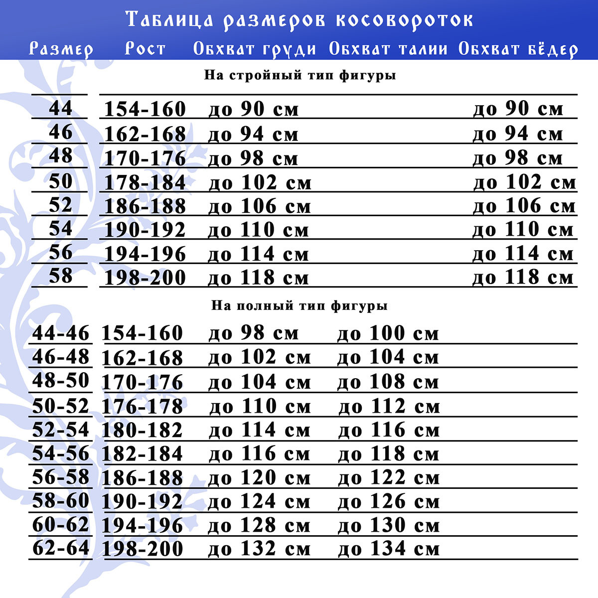 Чтобы выбрать косоворотку нужного размера, необходимы три мерки: рост, обхват груди и обхват талии. Далее, ориентируясь по таблице размеров, найдите свой размер. Также обратите внимание на тип фигуры.